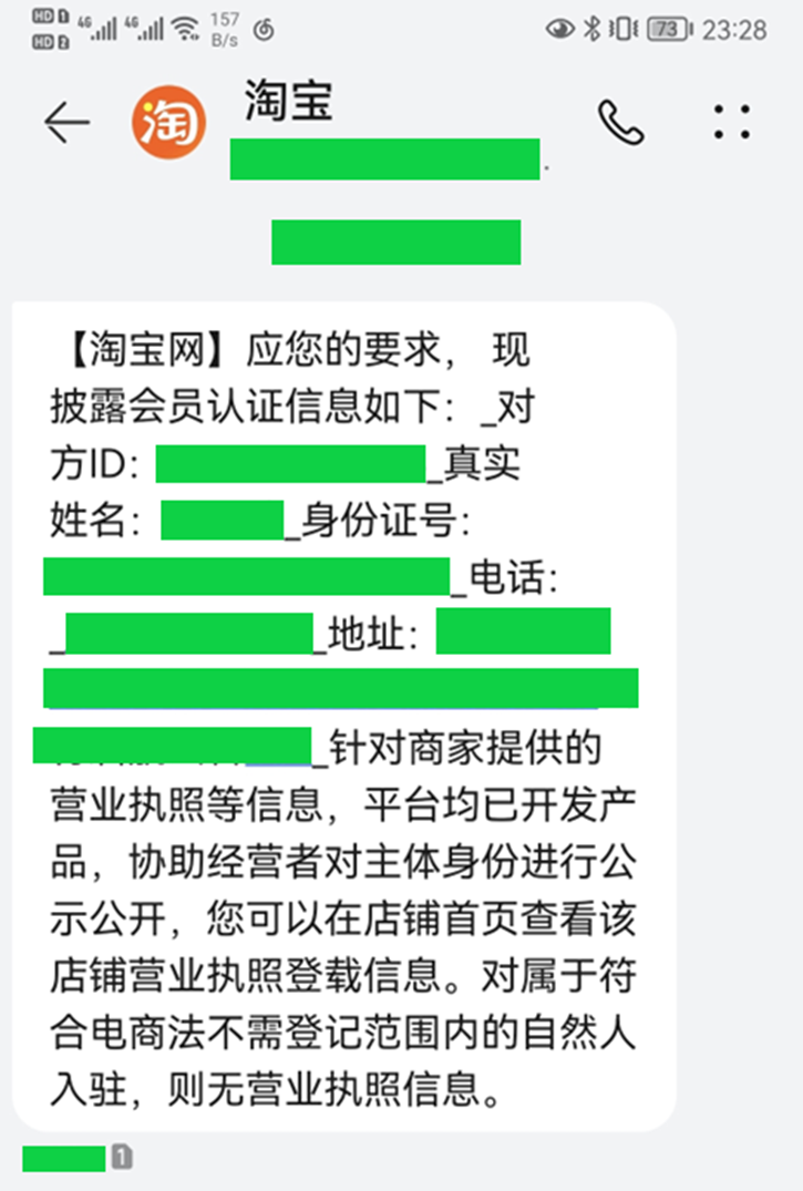 留意淘宝官方发送的短信,短信包含卖家姓名、身份证号、地址等信息。