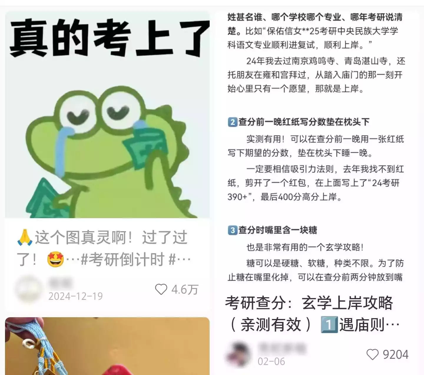 在考研话题下,超过半数的互动帖含有“玄学”元素。考生们自发形成一套完整的神秘主义体系:转发特定色系的“上岸神图”,在凌晨准点发布祈福弹幕,甚至衍生出“复试前吃紫色食物”(紫定胜)的饮食戒律。这种看似荒诞的行为,实则是将现实压力转化为可操作的“电子仪式”。